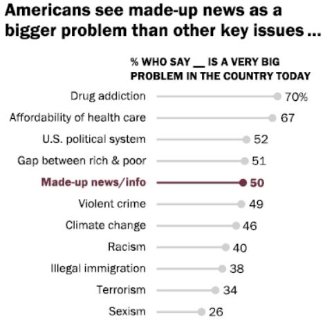 2020년은 한국의 총선, 미국의 대선을 비롯해 영국 지방선거, 프랑스 지방의회 총선거 등 주요국의 선거가 치러질 예정이다. 선거철과 맞물려 가짜 뉴스가 기승을 부릴 수 있어 각별한 주의가 필요하다. 위의 그래프에 따르면 미국인들은 가짜 뉴스(Made-up news/info : 대중을 오도하기 위해 만들어진 뉴스)가 테러리즘이나 인종차별보다 더 큰 문제임을 인식하고 있다. 가짜 뉴스는 사회 안보와 정부의 신뢰에 대한 매우 큰 위험요소로 작용이 가능하며, 사회적 영향뿐만 아니라 신원 도용, 개인 디지털 정보를 조작한 가짜 메시지 작성에 의하여 개인의 위험 또한 커질 수 있다.