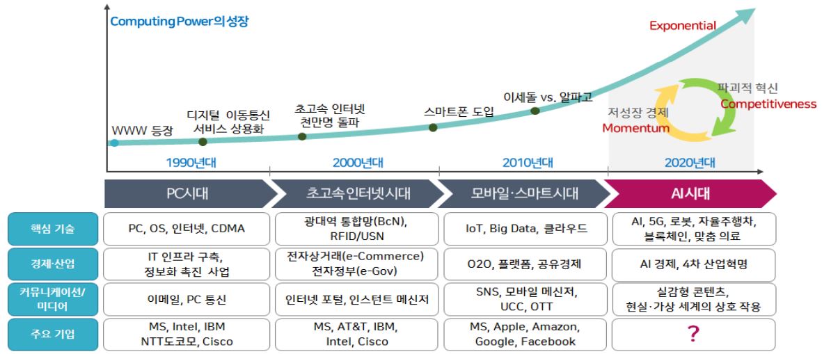 1990년대 이후, 정보통신기술은 10년 주기로 새로운 시대를 열어왔다. PC시대('90년대)에서 인터넷시대('00년대)로 이어서 모바일시대('10년대)로 변화하였다. 기하급수적인 컴퓨팅 기술의 발전으로 인공지능 기술이 한 단계 더 높이 발전하며 2020년대는 인공지능 시대로 도래하였다. 인공지능은 전반적인 산업 영역에 파급되며 경쟁구조의 전면적 변화로 작용하며, 그 자체가 물리적 자본이며, 단순한 생산성 증대 요소를 넘어 노동력을 대체할 수 있는 새로운 생산요소로 부상하고 있다. 세계 1위의 회계 감사 기업인 프라이스워터하우스쿠퍼스에서는 2030년에 전 세계 GDP는 114조 달러로 추정되며, AI를 활용한다면 최대 14%(약 15.7조 달러)가 더 향상될 수 있다고 분석하였다.