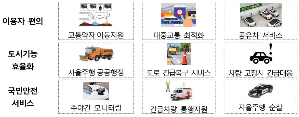 대한민국 대표 자동차 기업 현대차, 독일의 자동차 명가 메르세데스-벤츠, BMW, 아우디 등은 2020년에서 2022년 사이에 고속도로에서도 운전자의 관여 없이 시스템 자율주행이 가능한 레벨 3 기술의 차량을 상용화 목표로 기술 개발 중이며, 미국의 시장조사 업체 IHS는 전 세계적으로 자율주행차 판매량이 2021년 5만 1천대에서 2040년에는 3천3백만대 이상으로 증가할 것으로 예상하고 있다. 우리나라에서는 자율주행차를 활용하여 교통약자 이동지원, 차량 고장 시 긴급대응, 자율주행 순찰 등 다양한 공공서비스를 추진하여 수요를 창출할 예정이다.